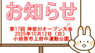 神奈川オープン 第17回 神奈川オープン大会(公認大会D) 開催のお知らせ 日時 令和7年10月12日(日)受付 8時~会場 小田原市上府中運動公園スポーツ広場競技 トリプルス 64チーム(時間制50分)期限 令和7年9月21日(日)まで参加費 日ぺ会員 1,500円、非会員 2,500円開催要項と申込書はこちらか... 神奈川オープン