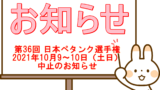 第34回日本ペタンク選手権大会中止のお知らせ お知らせ 2020.06.202020.06.24 今年の日本ペタンク選手権大会は中止となりました。よって選考会もありません。尚、来年2021年10月9日(土)~10日(日)に開催予定です。